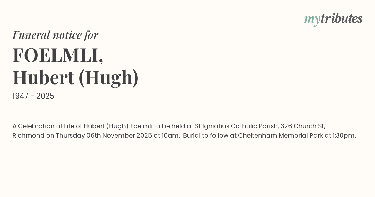 15°CA Celebration of Life of Hubert (Hugh) Foelmli to be held at St Igniatius Catholic Parish, 326 Church St, Richmond on Thursday 06th November 2025 at 10am. Burial to follow at Cheltenham Memorial Park at 1:30pm.