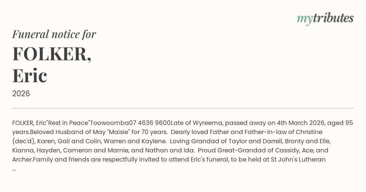 Family and friends are respectfully invited to attend Eric's funeral, to be held at St John's Lutheran Church, 431 Bridge Street, Wilsonton, service commencing at 9:30am, Wednesday, 18th March 2026.