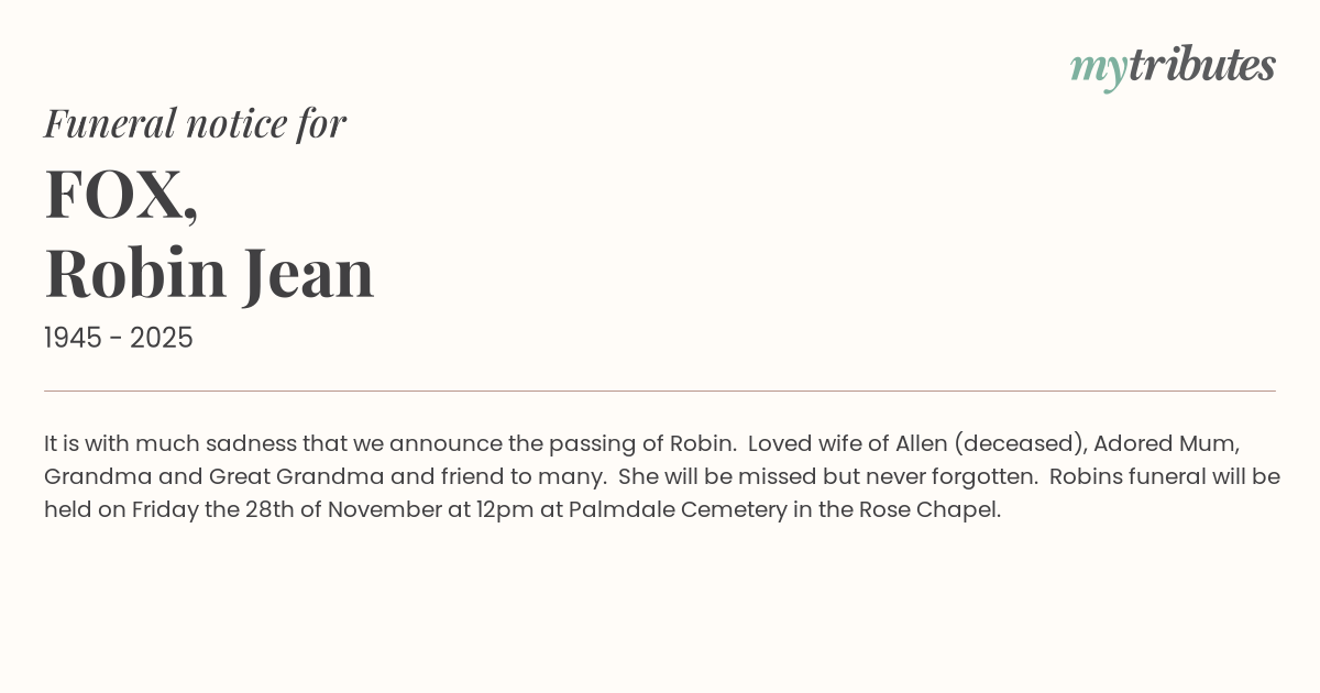 15°CIt is with much sadness that we announce the passing of Robin. Loved wife of Allen (deceased), Adored Mum, Grandma and Great Grandma and friend to many. She will be missed but never forgotten. Robin’s funeral will be held on Friday the 28th of November at 12pm at Palmdale Cemetery in the Rose Chapel.