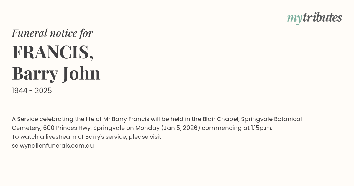 15°CA Service celebrating the life of Mr Barry Francis will be held in the Blair Chapel, Springvale Botanical Cemetery, 600 Princes Hwy, Springvale on Monday (Jan 5, 2026) commencing at 1.15p.m.