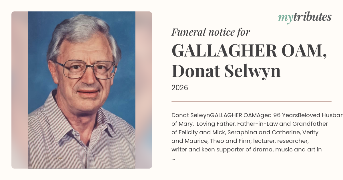 Beloved Husband of Mary. Loving Father, Father-in-Law and Grandfather of Felicity and Mick, Seraphina and Catherine, Verity and Maurice, Theo and Finn; lecturer, researcher, writer and keen supporter of drama, music and art in Townsville.