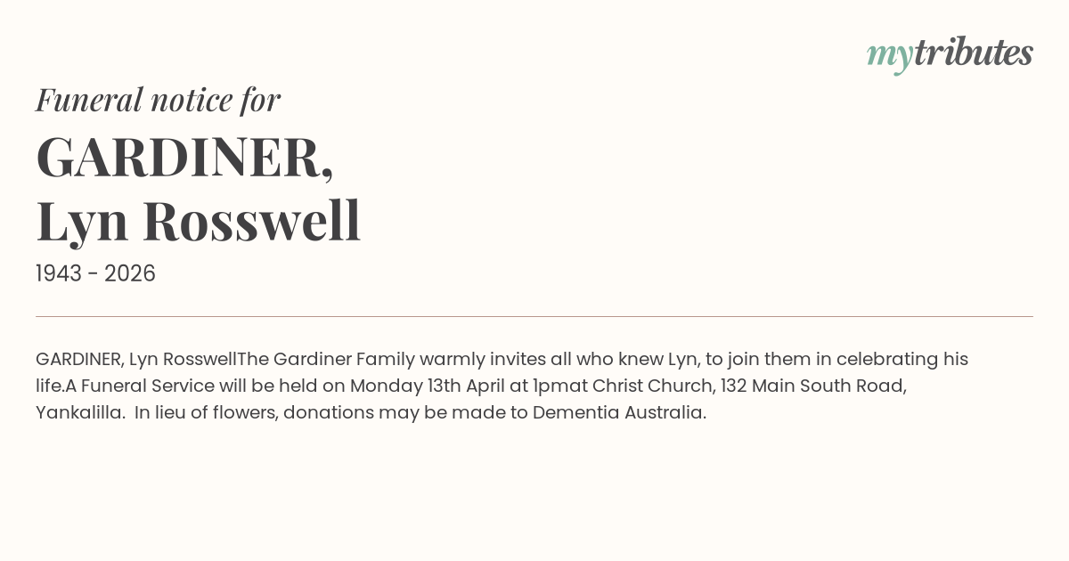 The Gardiner Family warmly invites all who knew Lyn, to join them in celebrating his life.