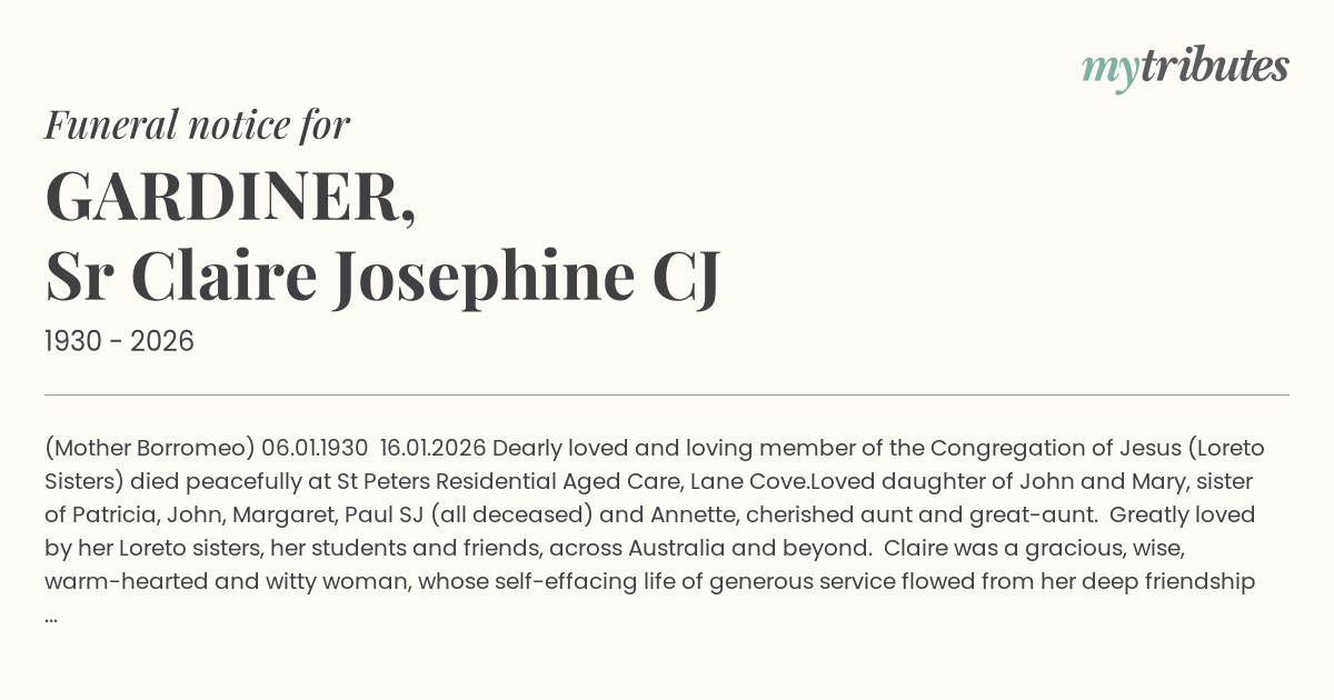 The funeral will leave the church at the conclusion of Mass for Macquarie Park Cemetery, corner Delhi and Plassey Roads, North Ryde. Mass will be live streamed and may be accessed by entering the following link, https://www.FuneralVideo.com.au/SrClaireGardiner