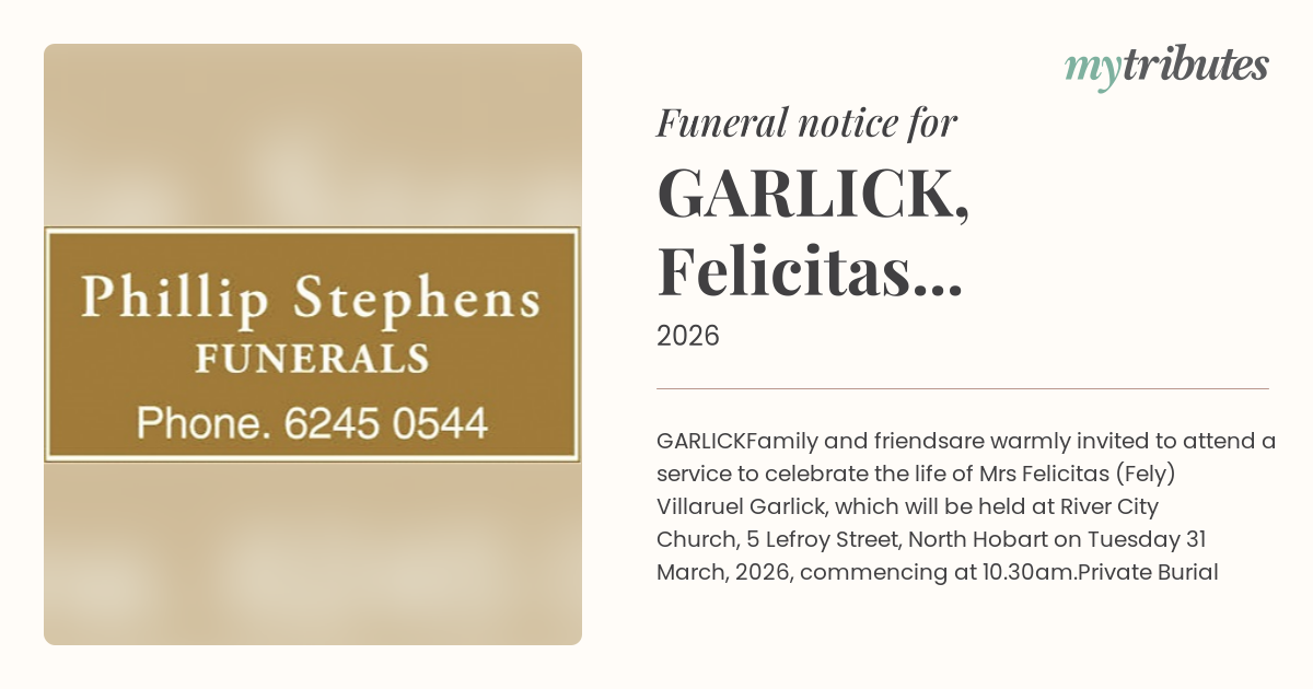 are warmly invited to attend a service to celebrate the life of Mrs Felicitas (Fely) Villaruel Garlick, which will be held at River City Church, 5 Lefroy Street, North Hobart on Tuesday 31 March, 2026, commencing at 10.30am.