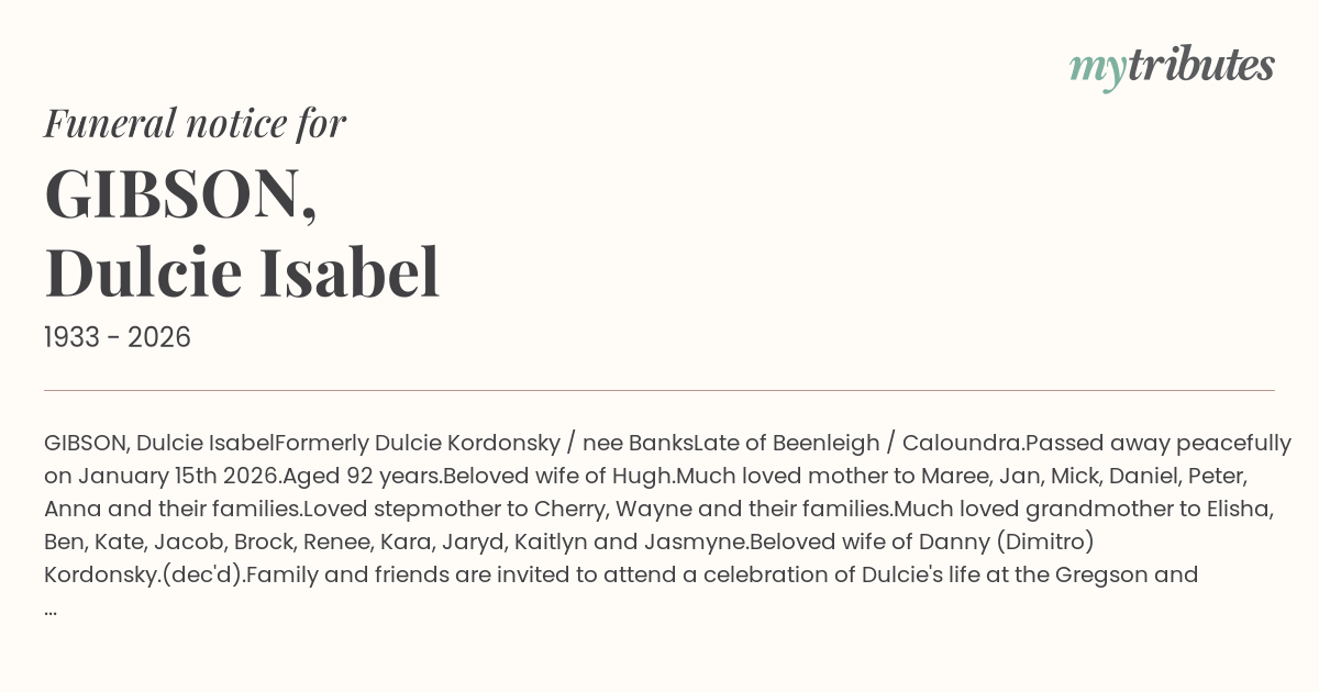 Family and friends are invited to attend a celebration of Dulcie's life at the Gregson and Weight Chapel, 5 Gregson Place Caloundra,