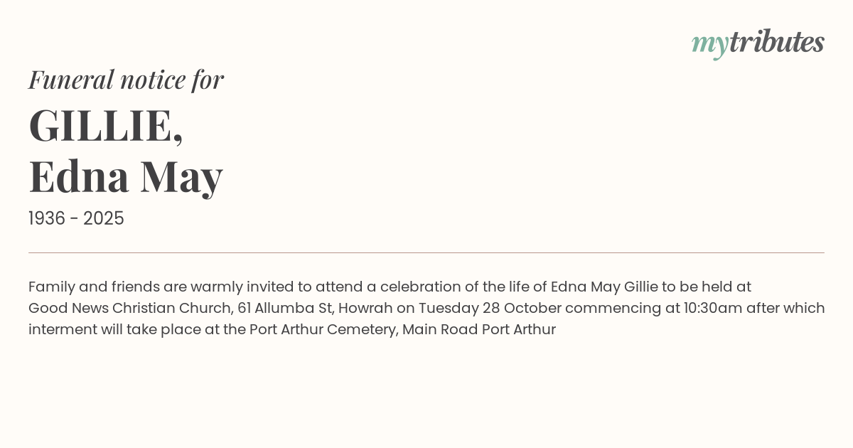 15°CFamily and friends are warmly invited to attend a celebration of the life of Edna May Gillie to be held at
