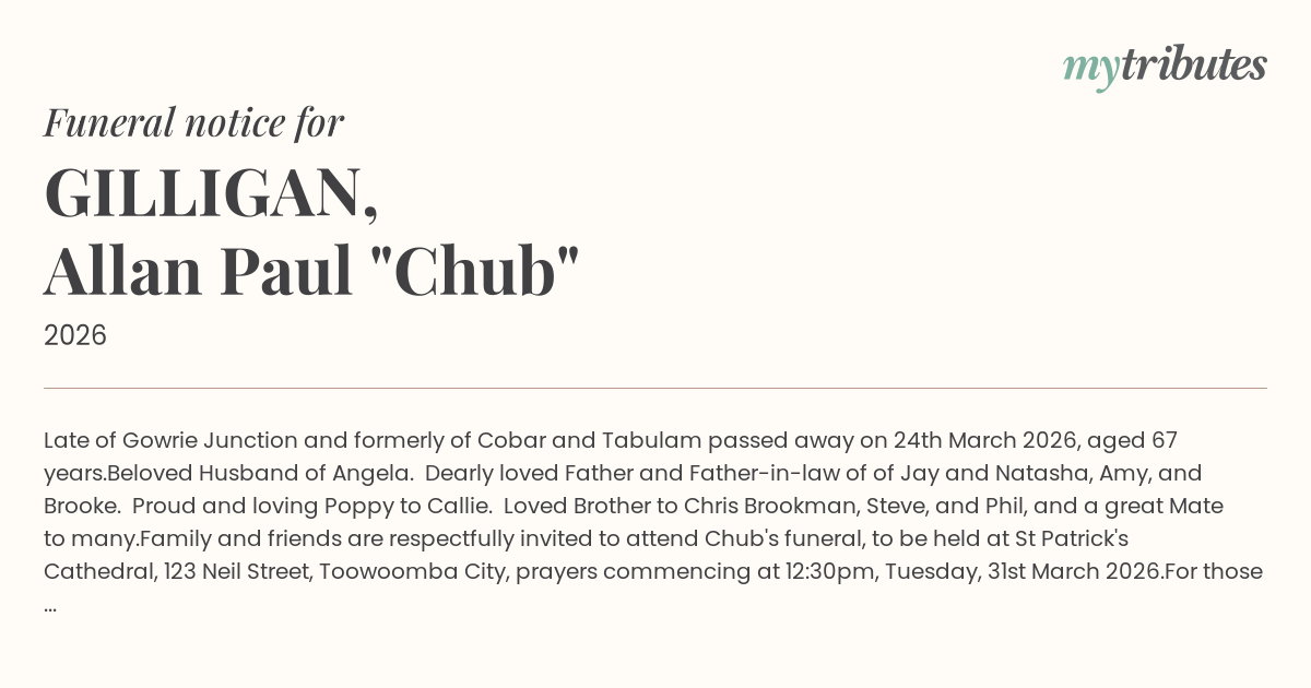 Family and friends are respectfully invited to attend Chub's funeral, to be held at St Patrick's Cathedral, 123 Neil Street, Toowoomba City, prayers commencing at 12:30pm, Tuesday, 31st March 2026.