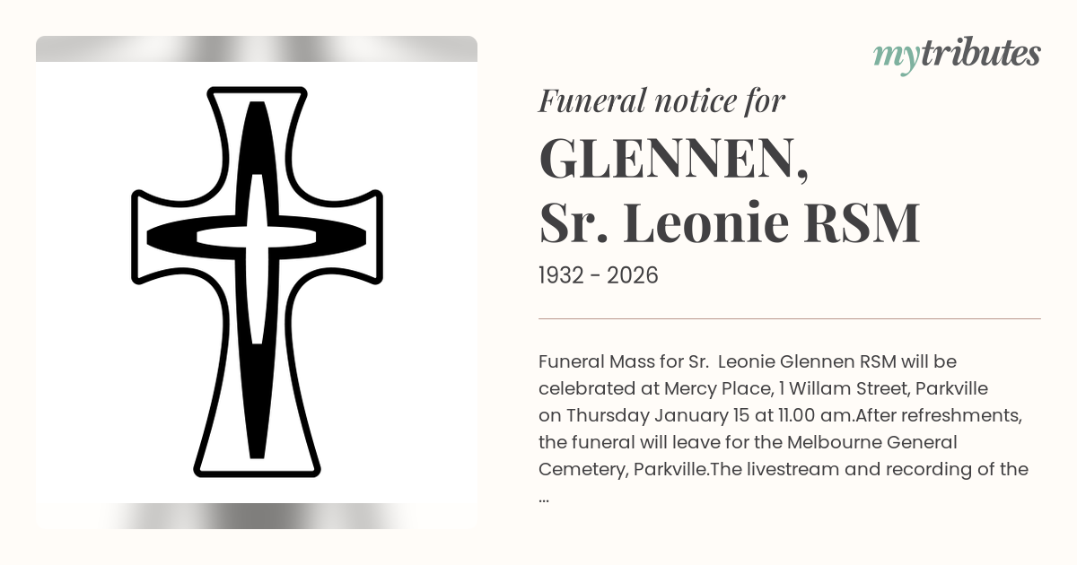 15°CFuneral Mass for Sr. Leonie Glennen RSM will be celebrated at Mercy Place, 1 Willam Street, Parkville on Thursday January 15 at 11.00 am.