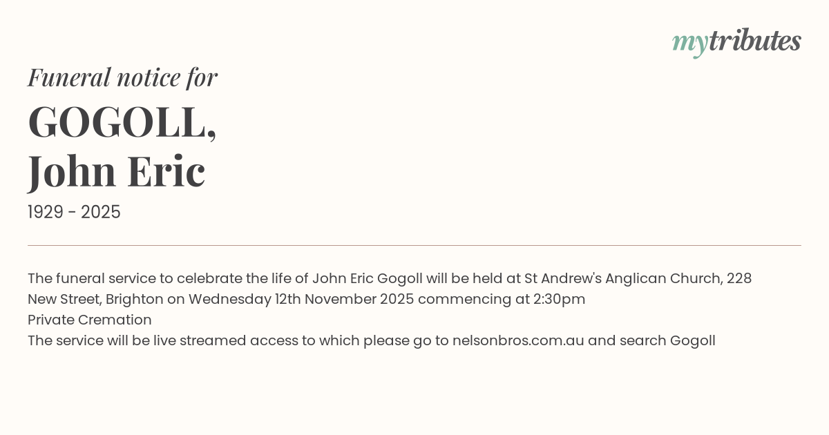 15°CThe funeral service to celebrate the life of John Eric Gogoll will be held at St Andrew's Anglican Church, 228 New Street, Brighton on Wednesday 12th November 2025 commencing at 2:30pm