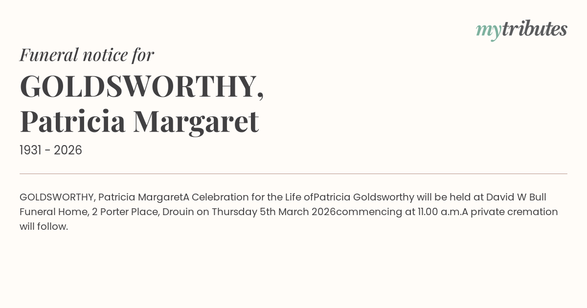 Patricia Goldsworthy will be held at David W Bull Funeral Home, 2 Porter Place, Drouin