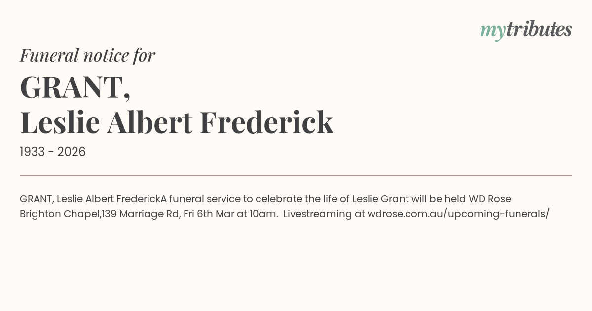 A funeral service to celebrate the life of Leslie Grant will be held WD Rose Brighton Chapel,139 Marriage Rd, Fri 6th Mar at 10am. Livestreaming at wdrose.com.au/upcoming-funerals/