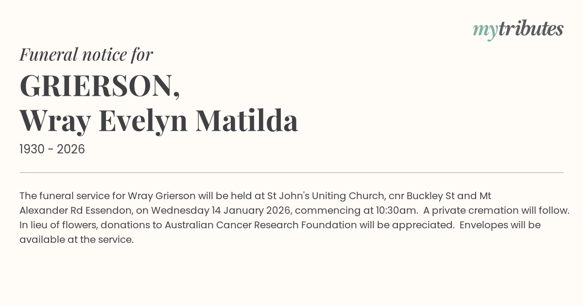 15°CThe funeral service for Wray Grierson will be held at St John's Uniting Church, cnr Buckley St and Mt Alexander Rd Essendon, on Wednesday 14 January 2026, commencing at 10:30am. A private cremation will follow.