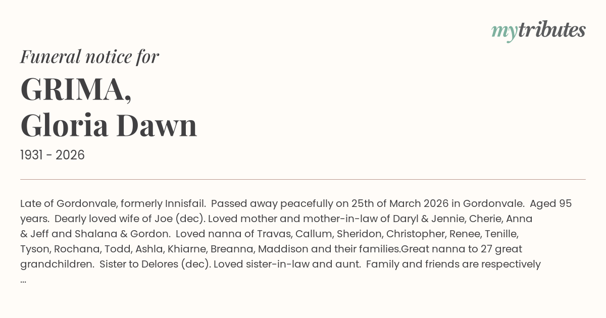 15°CLate of Gordonvale, formerly Innisfail. Passed away peacefully on 25th of March 2026 in Gordonvale. Aged 95 years.