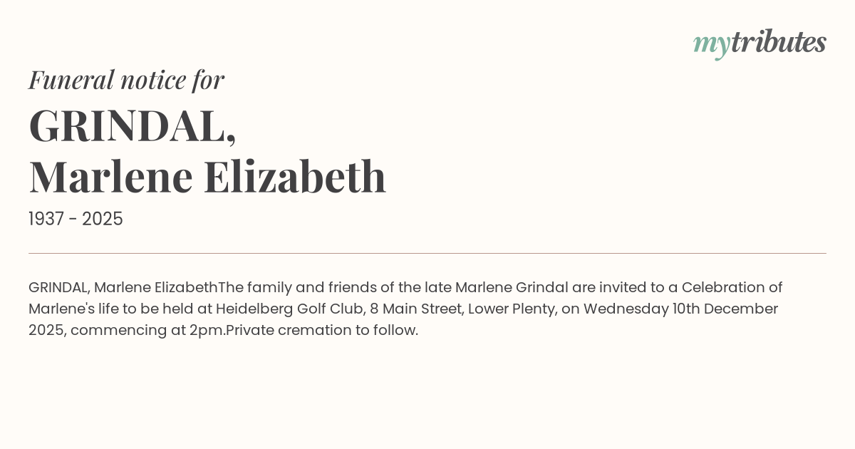 The family and friends of the late Marlene Grindal are invited to a Celebration of Marlene's life to be held at Heidelberg Golf Club,