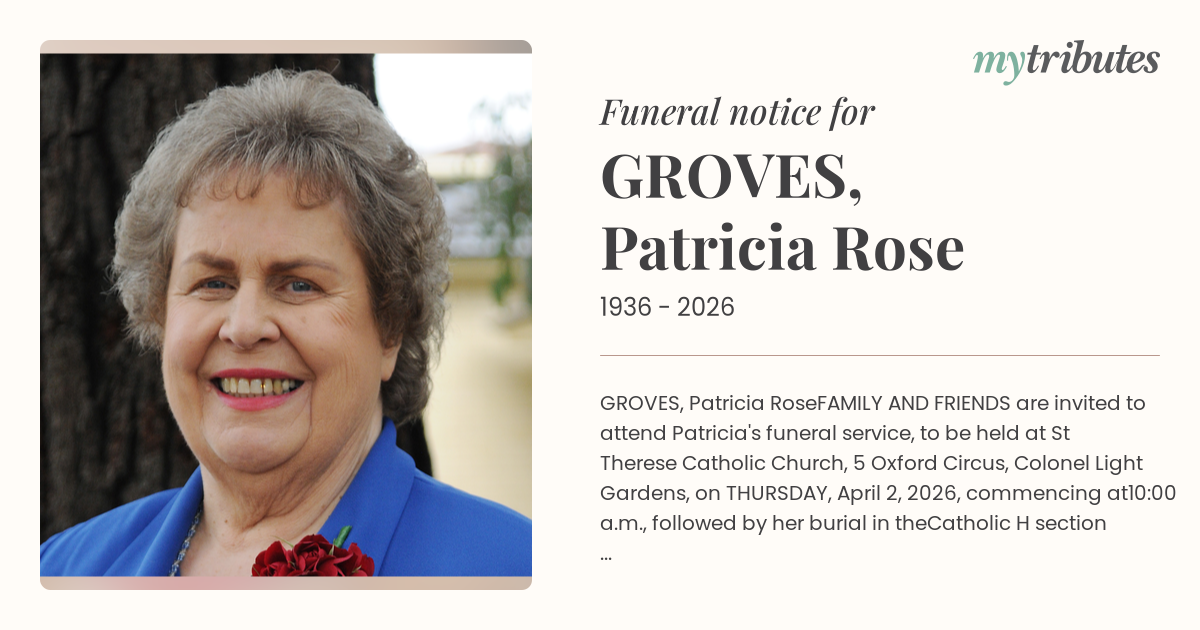 FAMILY AND FRIENDS are invited to attend Patricia's funeral service, to be held at St Therese Catholic Church, 5 Oxford Circus, Colonel Light Gardens, on THURSDAY, April 2, 2026, commencing at