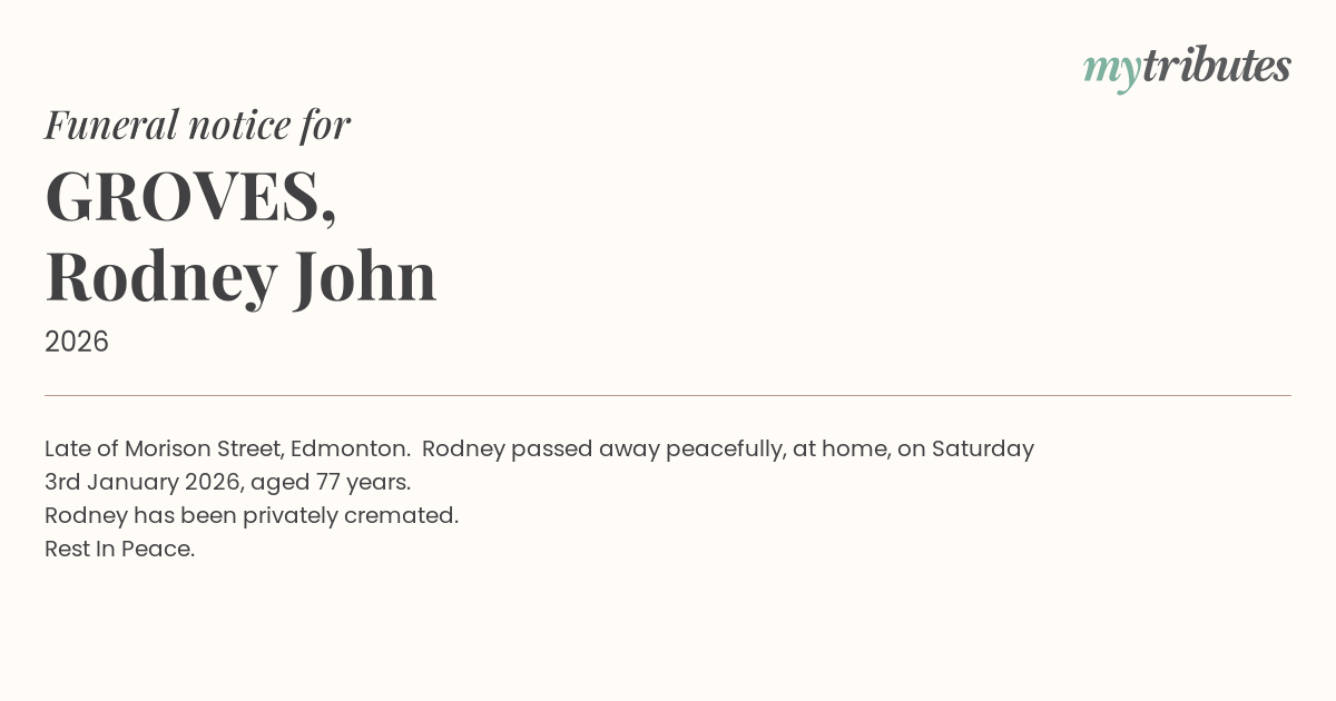 15°CLate of Morison Street, Edmonton. Rodney passed away peacefully, at home, on Saturday