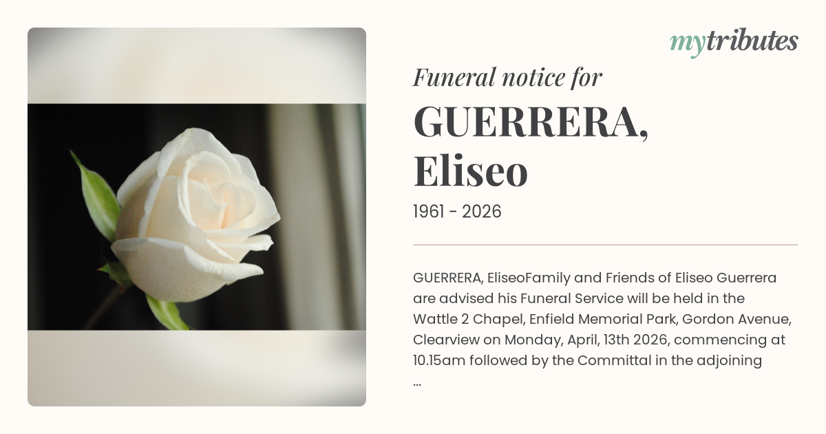 Family and Friends of Eliseo Guerrera are advised his Funeral Service will be held in the Wattle 2 Chapel,