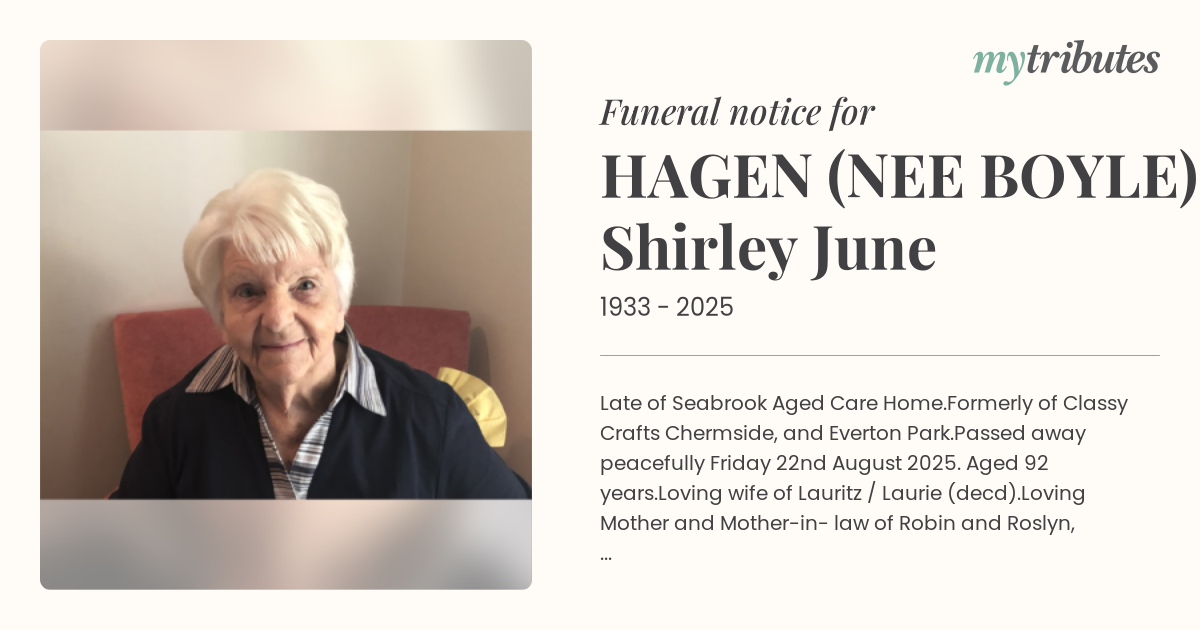 Family and friends are invited to a Celebration of Shirley’s life which is to be held in the Pinnaroo Crematorium Chapel, 285 Graham Road, Bridgeman Downs at 11.00am on Thursday, 4th September, 2025 followed by a private cremation.