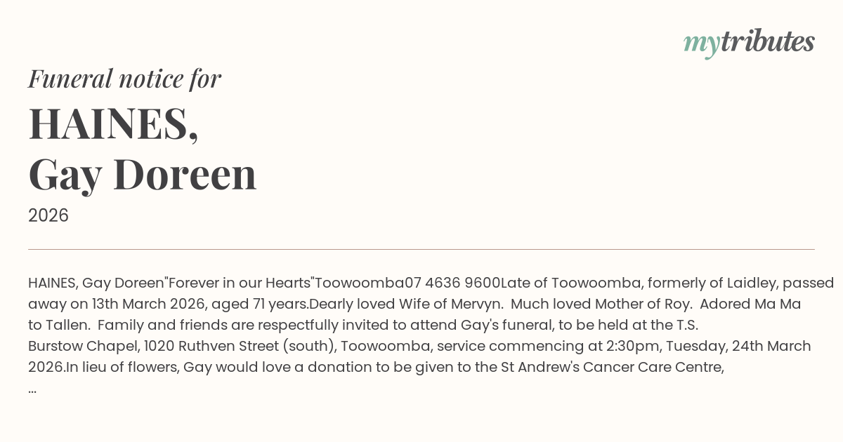Family and friends are respectfully invited to attend Gay's funeral, to be held at the T.S. Burstow Chapel, 1020 Ruthven Street (south), Toowoomba, service commencing at 2:30pm, Tuesday, 24th March 2026.