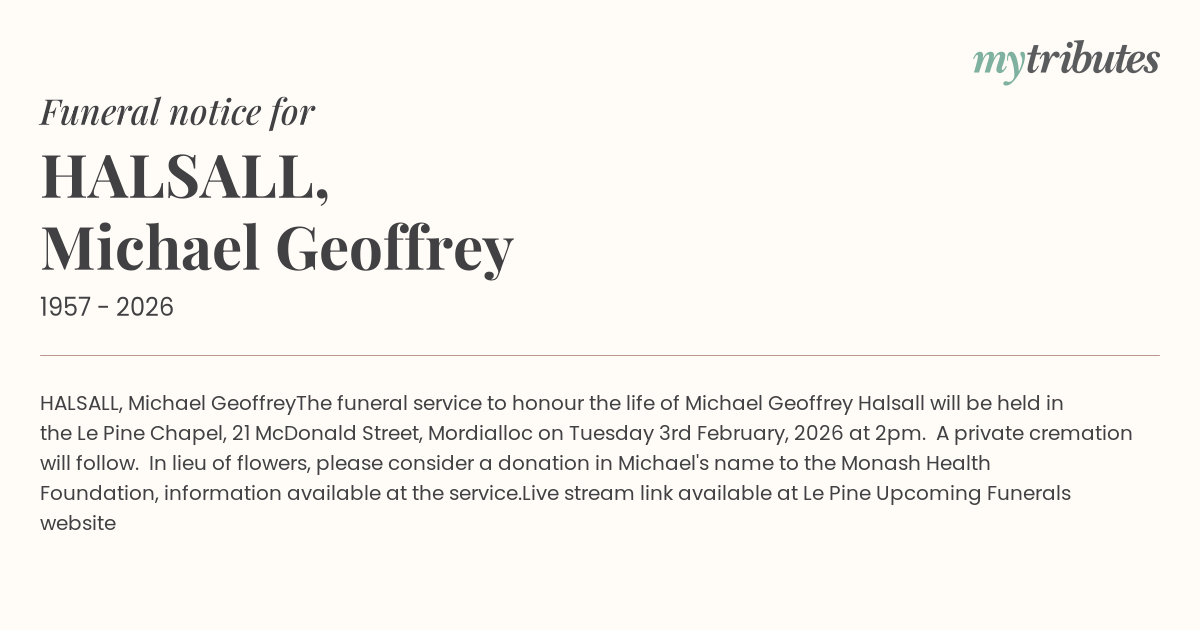 The funeral service to honour the life of Michael Geoffrey Halsall will be held in the Le Pine Chapel, 21 McDonald Street, Mordialloc on Tuesday 3rd February, 2026 at 2pm.
