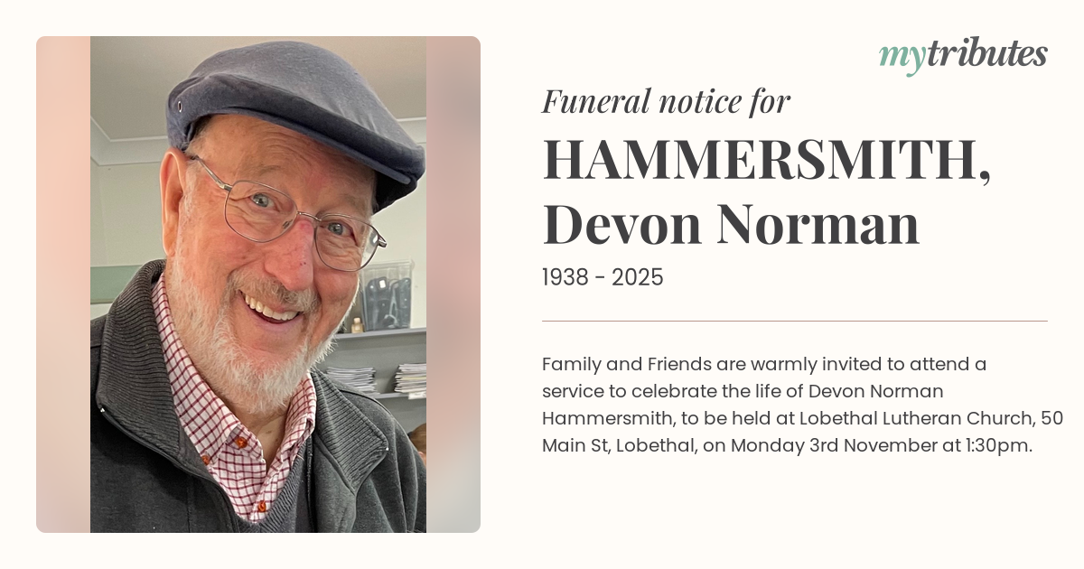 15°CFamily and Friends are warmly invited to attend a service to celebrate the life of Devon Norman Hammersmith, to be held at Lobethal Lutheran Church, 50 Main St, Lobethal, on Monday 3rd November at 1:30pm.