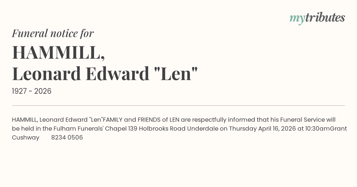 Fulham Funerals' Chapel 139 Holbrooks Road Underdale on Thursday April 16, 2026 at 10:30am