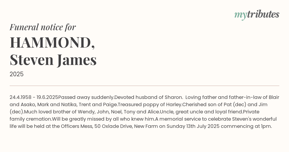 A memorial service to celebrate Steven's wonderful life will be held at the Officers Mess, 50 Oxlade Drive, New Farm on Sunday 13th July 2025 commencing at 1pm.