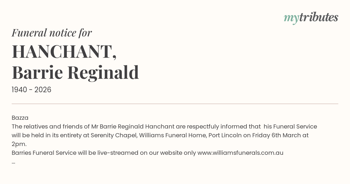 The relatives and friends of Mr Barrie Reginald Hanchant are respectfuly informed that his Funeral Service will be held in its entirety at Serenity Chapel, Williams Funeral Home, Port Lincoln on Friday 6th March at 2pm.