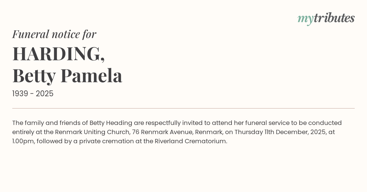 15°CThe family and friends of Betty Heading are respectfully invited to attend her funeral service to be conducted entirely at the Renmark Uniting Church, 76 Renmark Avenue, Renmark, on Thursday 11th December, 2025, at 1.00pm, followed by a private cremation at the Riverland Crematorium.