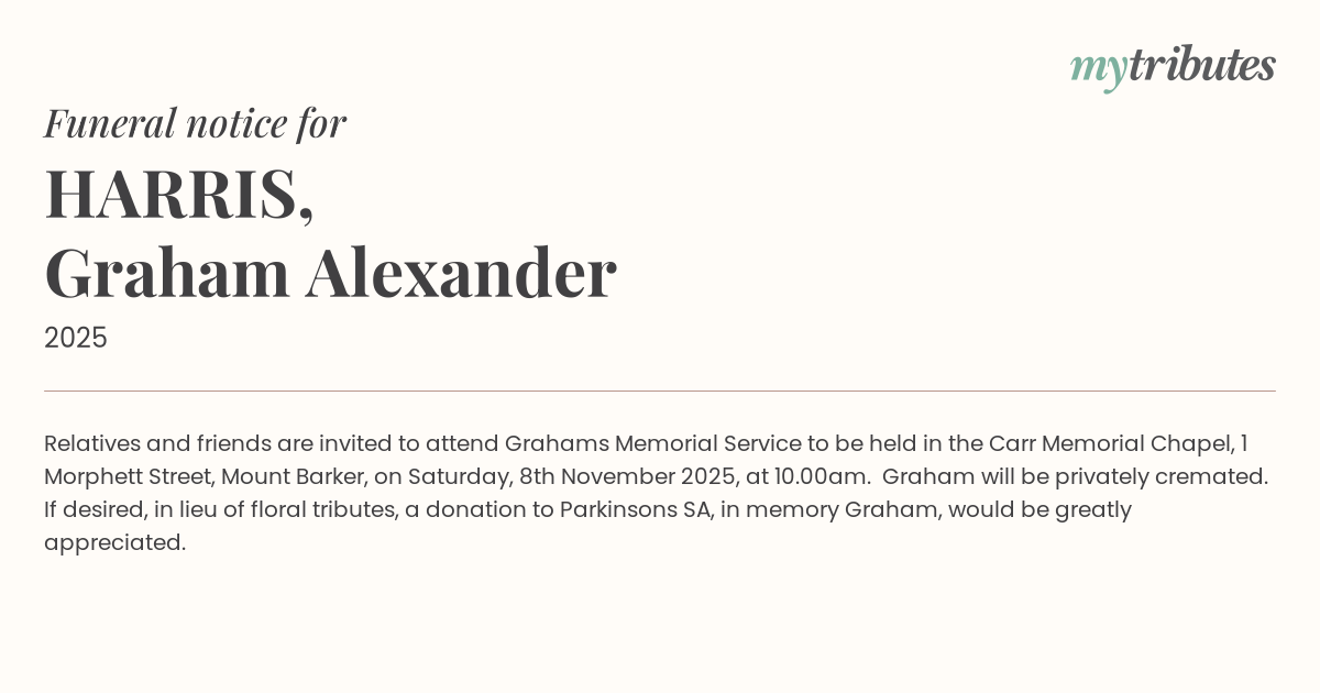 15°CRelatives and friends are invited to attend Graham’s Memorial Service to be held in the Carr Memorial Chapel, 1 Morphett Street, Mount Barker, on Saturday, 8th November 2025, at 10.00am. Graham will be privately cremated. If desired, in lieu of floral tributes, a donation to Parkinsons SA, in memory Graham, would be greatly appreciated.