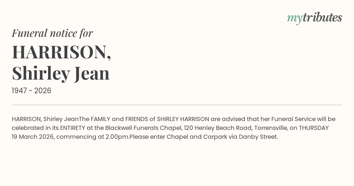 The FAMILY and FRIENDS of SHIRLEY HARRISON are advised that her Funeral Service will be celebrated in its ENTIRETY at the Blackwell Funerals Chapel, 120 Henley Beach Road, Torrensville, on THURSDAY 19 March 2026, commencing at 2.00pm.