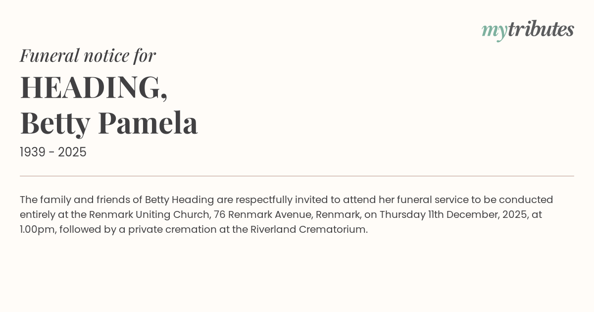 15°CThe family and friends of Betty Heading are respectfully invited to attend her funeral service to be conducted entirely at the Renmark Uniting Church, 76 Renmark Avenue, Renmark, on Thursday 11th December, 2025, at 1.00pm, followed by a private cremation at the Riverland Crematorium.