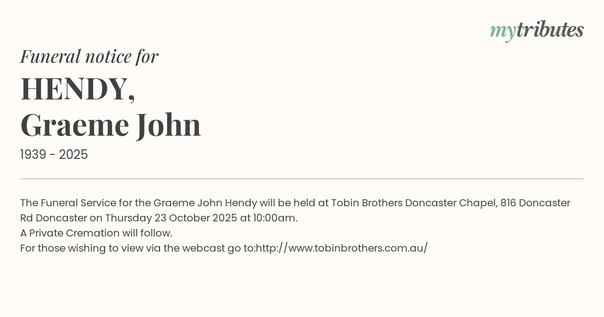 15°CThe Funeral Service for the Graeme John Hendy will be held at Tobin Brothers Doncaster Chapel, 816 Doncaster Rd Doncaster on Thursday 23 October 2025 at 10:00am.