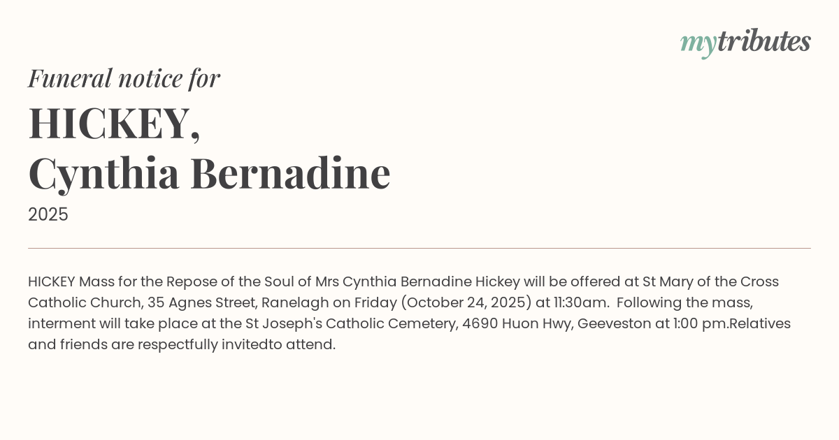 Mass for the Repose of the Soul of Mrs Cynthia Bernadine Hickey will be offered at St Mary of the Cross Catholic Church, 35 Agnes Street, Ranelagh on Friday (October 24, 2025) at 11:30am. Following the mass, interment will take place at the St Joseph's Catholic Cemetery, 4690 Huon Hwy, Geeveston
