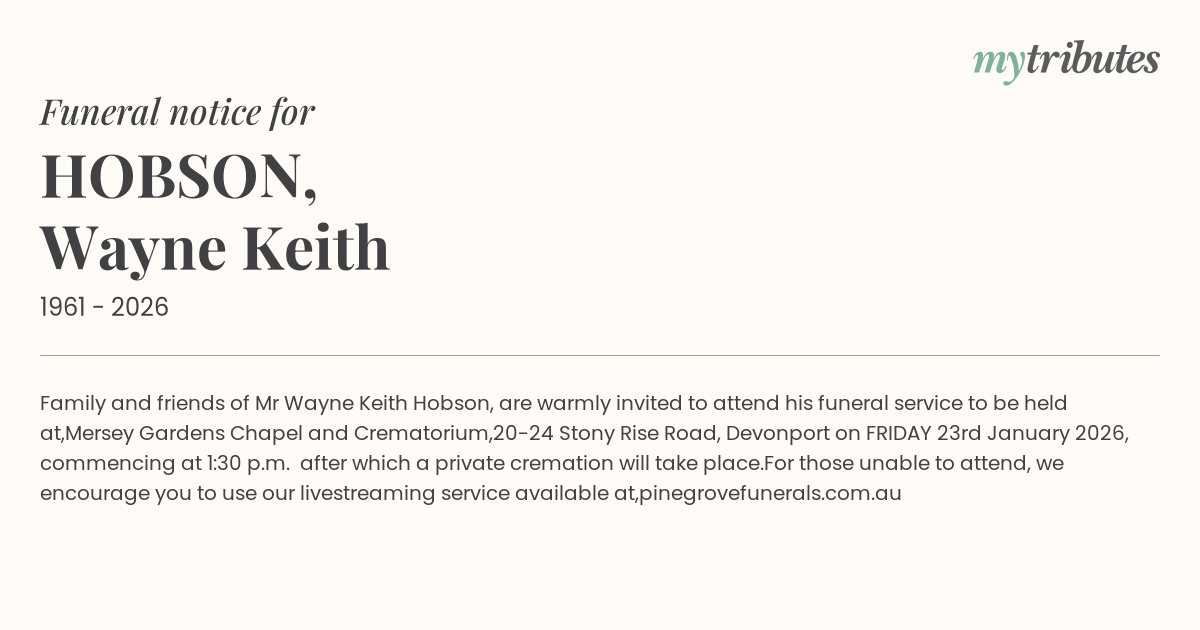 15°CFamily and friends of Mr Wayne Keith Hobson, are warmly invited to attend his funeral service to be held at, Mersey Gardens Chapel and Crematorium, 20-24 Stony Rise Road, Devonport on FRIDAY 23rd January 2026, commencing at 1:30 p.m. after which a private cremation will take place.