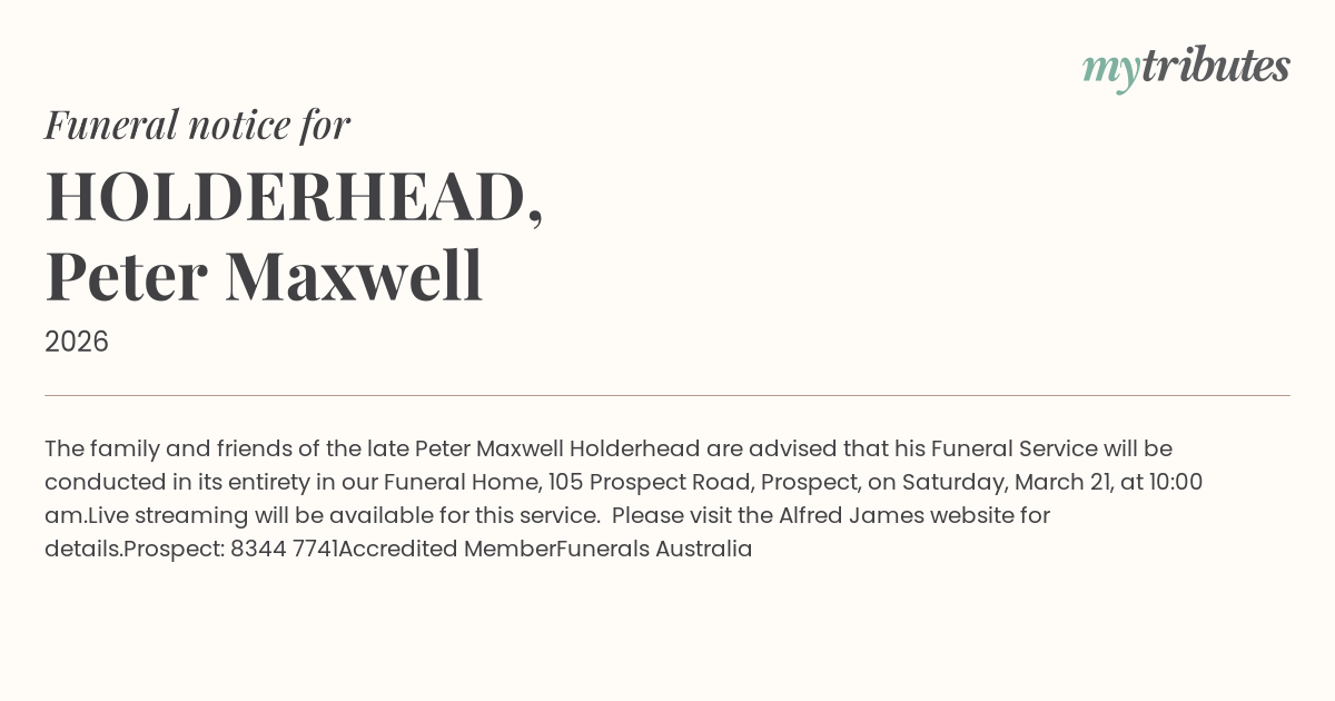 15°CThe family and friends of the late Peter Maxwell Holderhead are advised that his Funeral Service will be conducted in its entirety in our Funeral Home, 105 Prospect Road, Prospect, on Saturday, March 21, at 10:00 am.