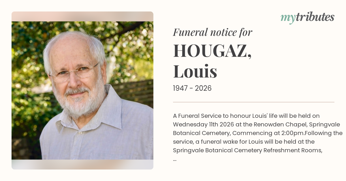 15°CA Funeral Service to honour Louis' life will be held on Wednesday 11th 2026 at the Renowden Chapel, Springvale Botanical Cemetery, Commencing at 2:00pm.