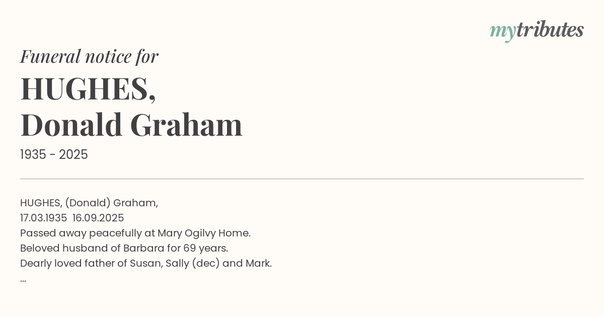 15°CHUGHES, (Donald) Graham, 17.03.1935 – 16.09.2025 Passed away peacefully at Mary Ogilvy Home. Beloved husband of Barbara for 69 years. Dearly loved father of Susan, Sally (dec) and Mark. Respected father-in-law of Chris Salmon and Keren Hughes. Much loved pop of Sarah, Brenton, Kate, Matthew, Nicholas and Jeremy and their partners. Much loved great pop of Kaizer, Harper, Oliver, Charlotte, Thomas, Henry, Leila, Remi and Louis. Graham did not want a formal funeral, so by way of a Celebration of Graham’s Life, the family would be pleased if you would join them in the Caroline Room, Black Buffalo Hotel, 2:30pm Monday 22nd September 2025 to share your stories of Graham.