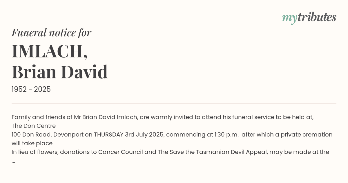 15°CFamily and friends of Mr Brian David Imlach, are warmly invited to attend his funeral service to be held at,