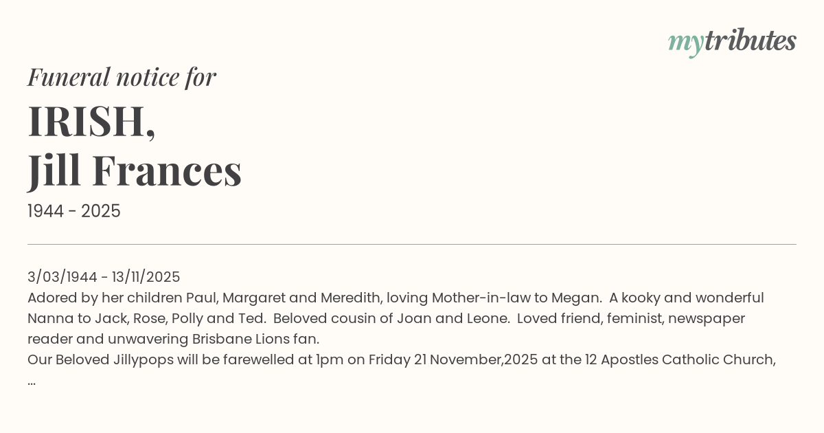 Adored by her children Paul, Margaret and Meredith, loving Mother-in-law to Megan. A kooky and wonderful Nanna to Jack, Rose, Polly and Ted. Beloved cousin of Joan and Leone. Loved friend, feminist, newspaper reader and unwavering Brisbane Lions fan.