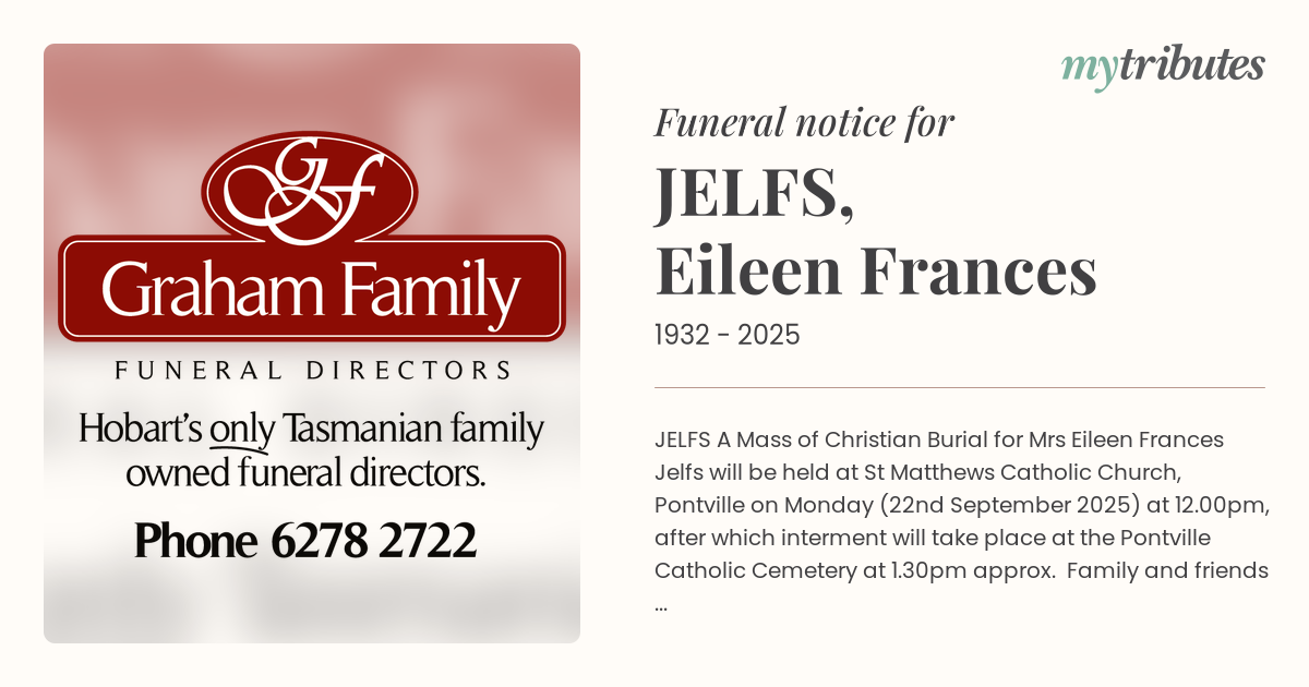 A Mass of Christian Burial for Mrs Eileen Frances Jelfs will be held at St Matthew’s Catholic Church, Pontville