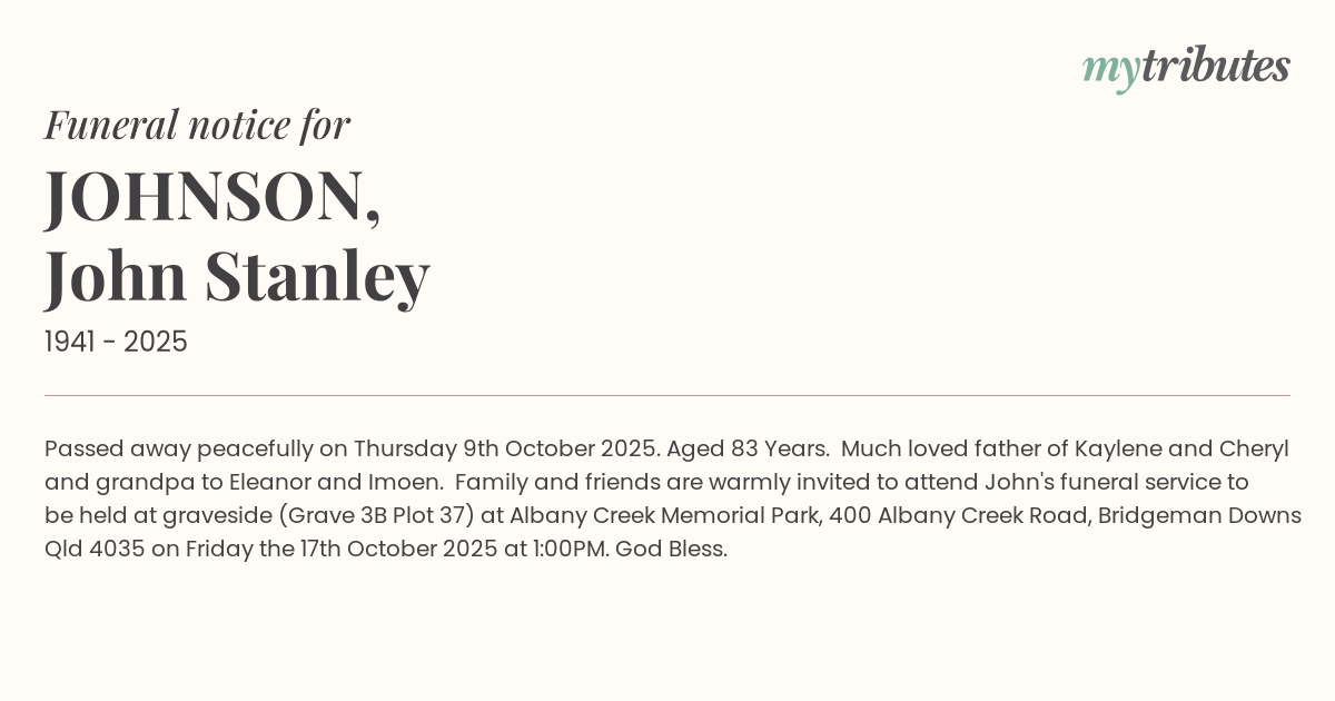 15°CPassed away peacefully on Thursday 9th October 2025. Aged 83 Years. Much loved father of Kaylene and Cheryl and grandpa to Eleanor and Imoen. Family and friends are warmly invited to attend John's funeral service to be held at graveside (Grave 3B Plot 37) at Albany Creek Memorial Park, 400 Albany Creek Road, Bridgeman Downs Qld 4035 on Friday the 17th October 2025 at 1:00PM. God Bless.