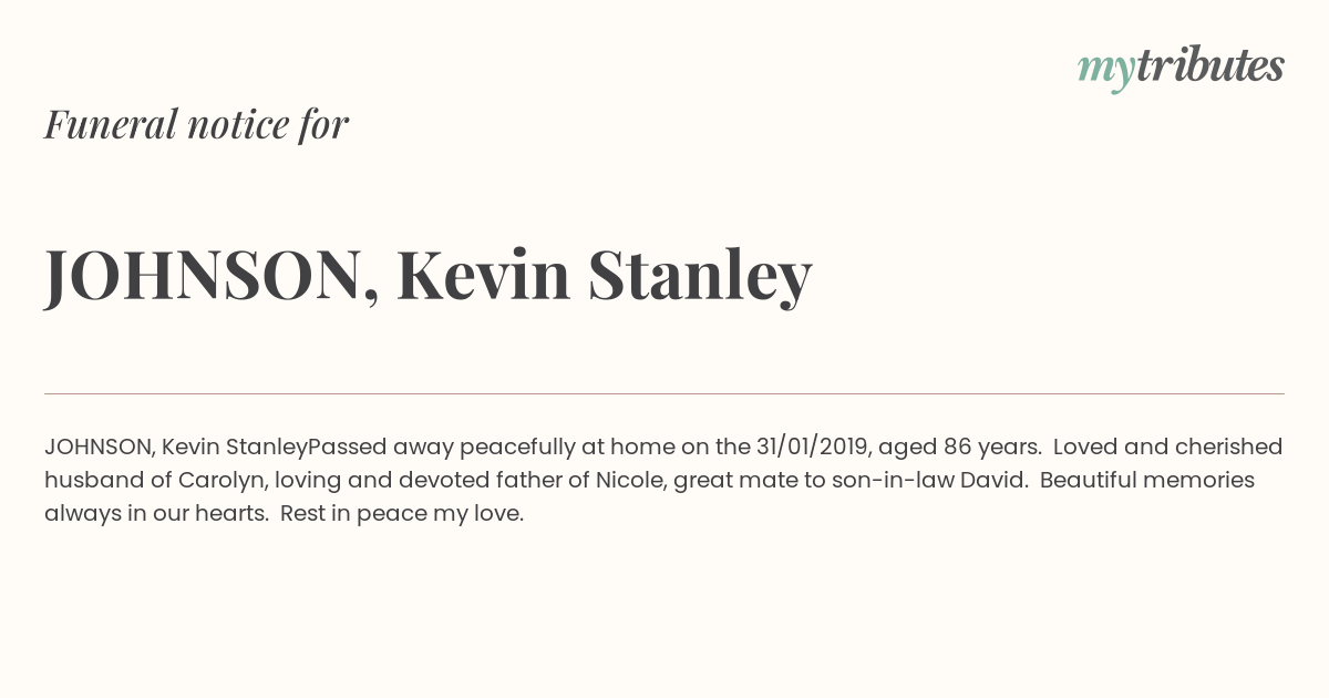 Passed away peacefully at home on the 31/01/2019, aged 86 years. Loved and cherished husband of Carolyn, loving and devoted father of Nicole, great mate to son-in-law David. Beautiful memories always in our hearts. Rest in peace my love.