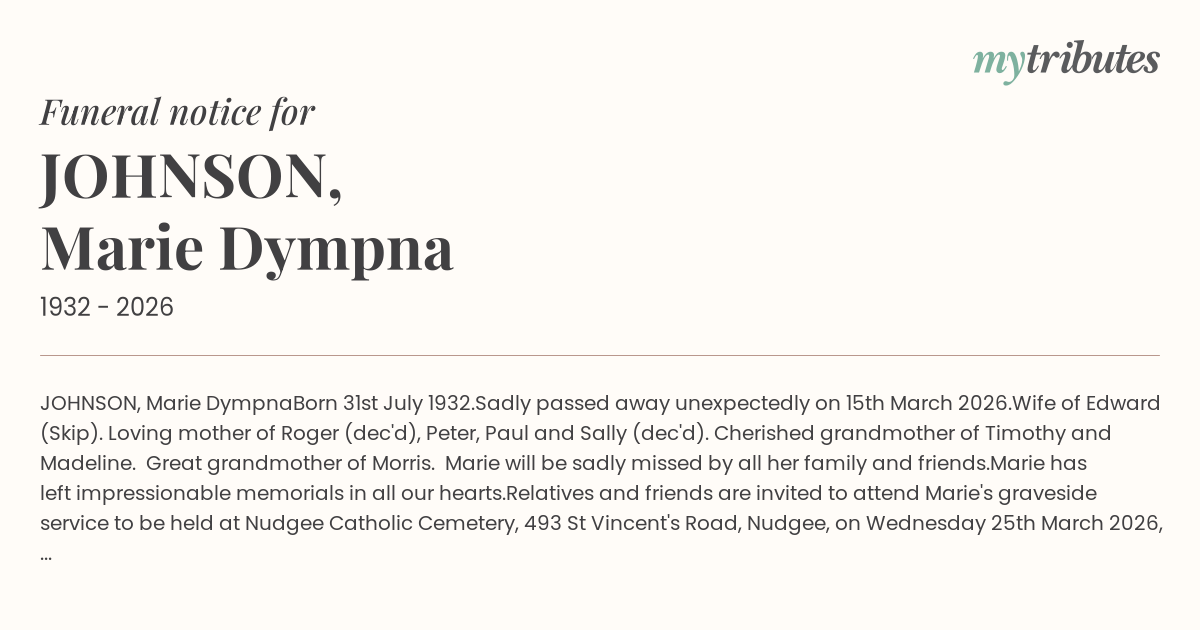 Relatives and friends are invited to attend Marie's graveside service to be held at Nudgee Catholic Cemetery, 493 St Vincent's Road, Nudgee, on Wednesday 25th March 2026, at 11 am.