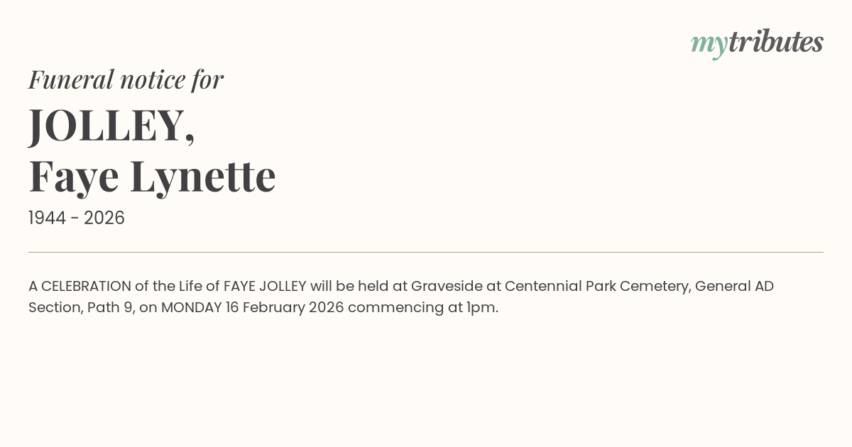15°CA CELEBRATION of the Life of FAYE JOLLEY will be held at Graveside at Centennial Park Cemetery, General AD Section, Path 9, on MONDAY 16 February 2026 commencing at 1pm.