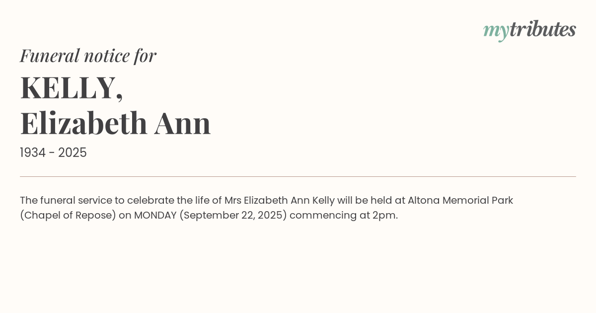 15°CThe funeral service to celebrate the life of Mrs Elizabeth Ann Kelly will be held at Altona Memorial Park (Chapel of Repose) on MONDAY (September 22, 2025) commencing at 2pm.