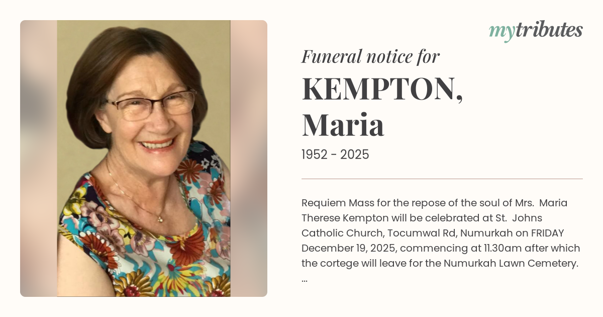 15°CRequiem Mass for the repose of the soul of Mrs. Maria Therese Kempton will be celebrated at St. John’s Catholic Church, Tocumwal Rd, Numurkah on FRIDAY December 19, 2025, commencing at 11.30am after which the cortege will leave for the Numurkah Lawn Cemetery.