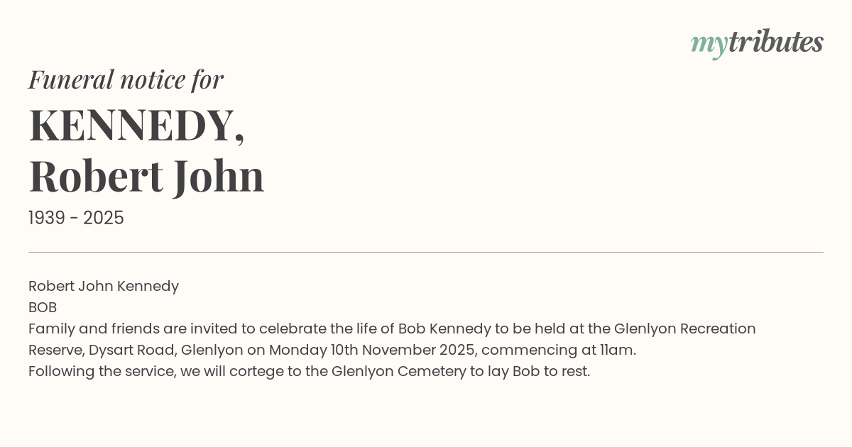 Family and friends are invited to celebrate the life of Bob Kennedy to be held at the Glenlyon Recreation Reserve, Dysart Road, Glenlyon on Monday 10th November 2025, commencing at 11am.