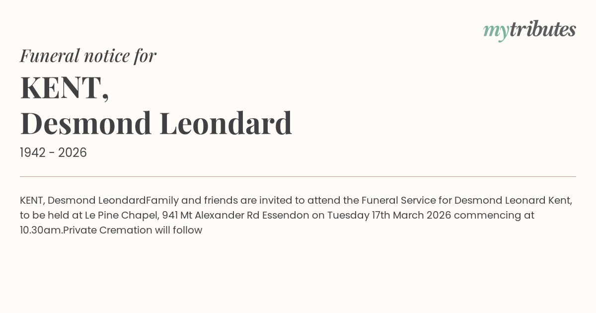 Family and friends are invited to attend the Funeral Service for Desmond Leonard Kent,