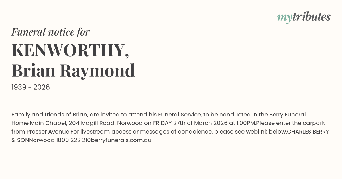 15°CFamily and friends of Brian, are invited to attend his Funeral Service, to be conducted in the Berry Funeral Home Main Chapel, 204 Magill Road, Norwood on FRIDAY 27th of March 2026 at 1:00PM.